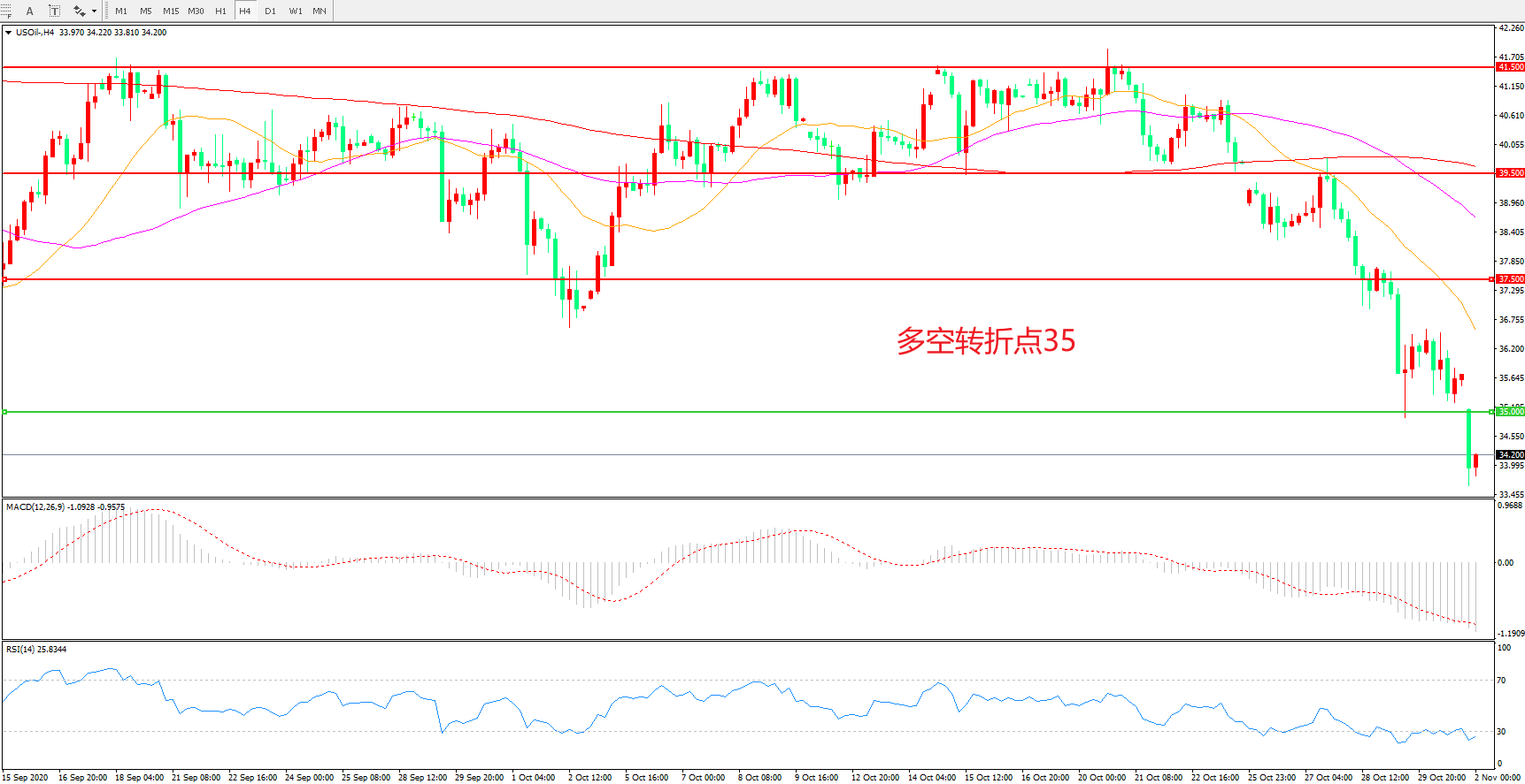 在经历了长达半年的相对平静期后,全球疫情二次爆发, 并再一次将原油价格打入“深渊” ,美国WTI原油连续第三日收跌,创五个月以来新低,当周累积跌幅高达11%。周一(11月2日),WTI原油跳空低开,随后下破34美元/桶,截止发稿前报33.95美元/桶。