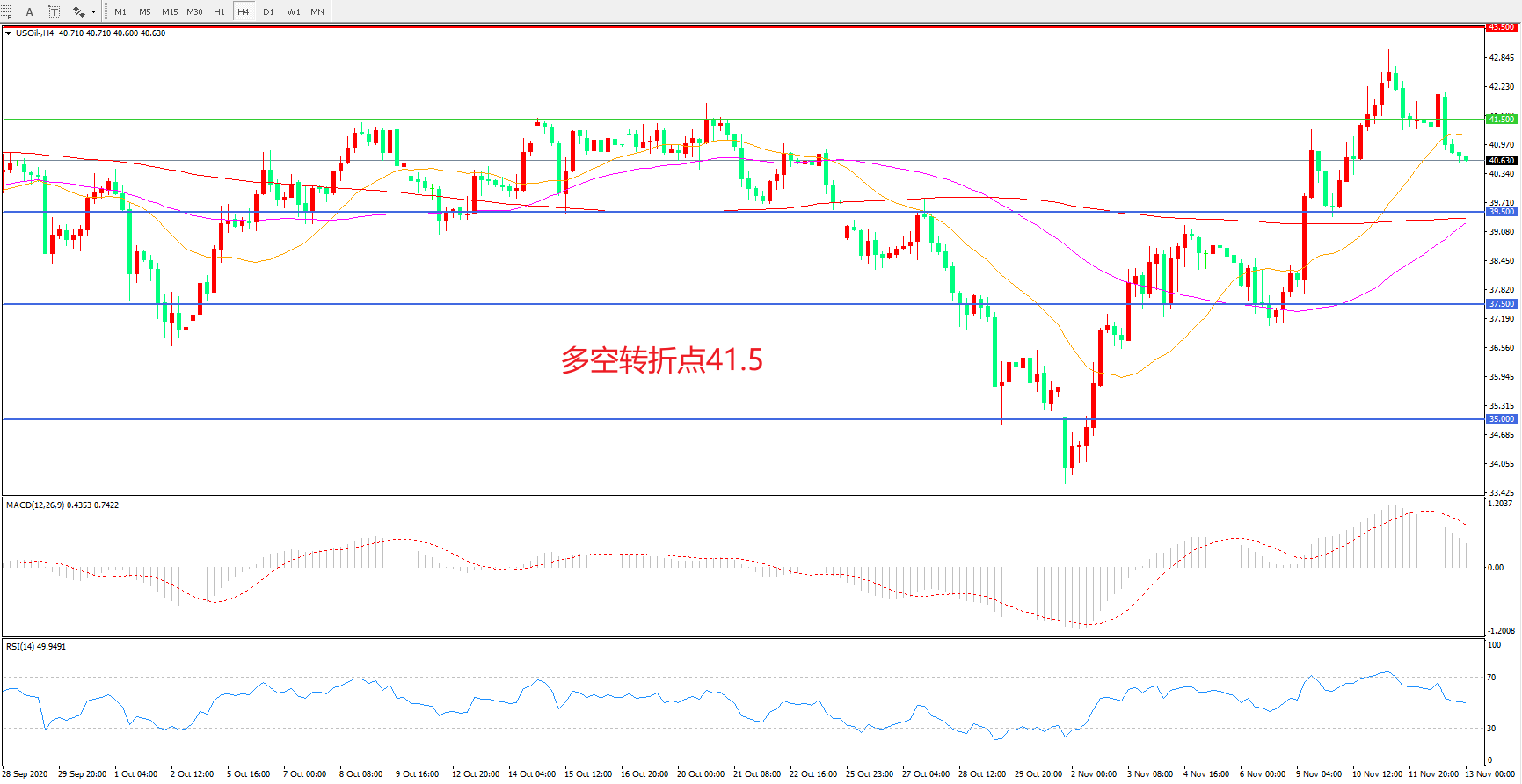 4小时图看,油价延续冲高回落形态,短期涨势暂缓,41.5成为上方阻力,短期均线有拐头迹象,MACD红柱减少,RSI指标走平,日内震荡下行概率较大。