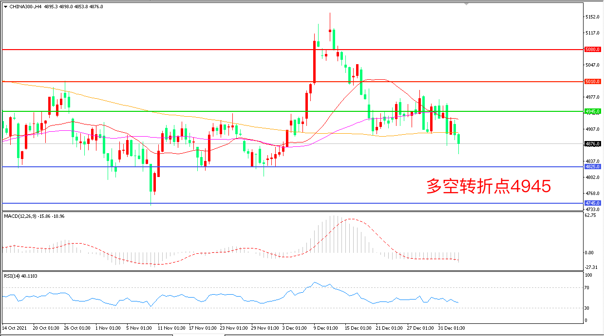 4小时图看,沪深300跌破4945一线后连续回撤,短期走势陷入低迷,均线系统成为祖鲁,4825成为支撑, MACD绿柱增加,RSI指标走平,日内震荡下行概率较大。