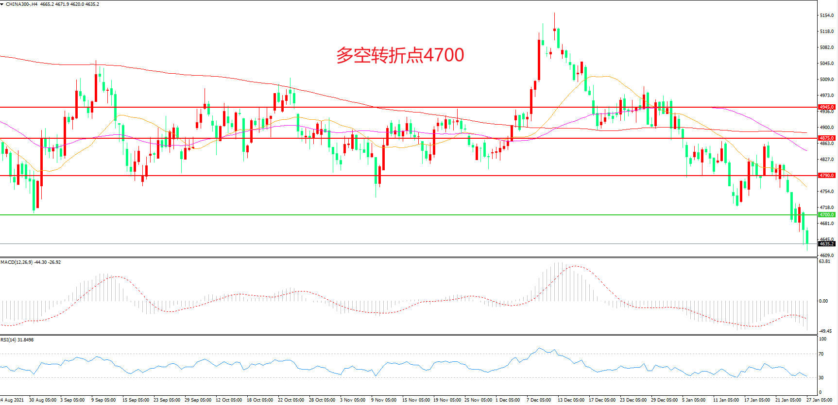 周四(1月27日),三大指数全天低开低走,再度刷新近期低点,沪深300指数“一泻千里”,收报4635.2点。两市成交额8230亿,北向资金净卖出146.24亿元。美联储议息会议暗示3月加息、并表示不排除每次议息会议都加息的可能性,其鹰派程度超出市场预期,海外市场的扰动叠加春节休市前的流动性枯竭,A股延续下行概率较大。