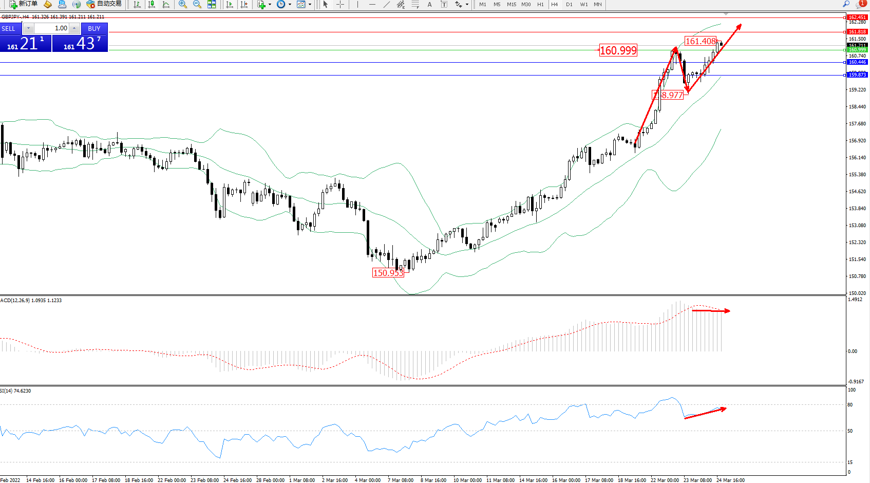 技术点评:多头动力延续布林带指标通道中上轨区间持续震荡上扬,高位抵达161.408附近开始整理,短期多头上扬走势或将持续,布林带指标呈上行趋势缓慢张口后开始收口,MACD指标处于多头区域高位维持整理平移,RSI指标处于多头区域维持缓慢上移中;