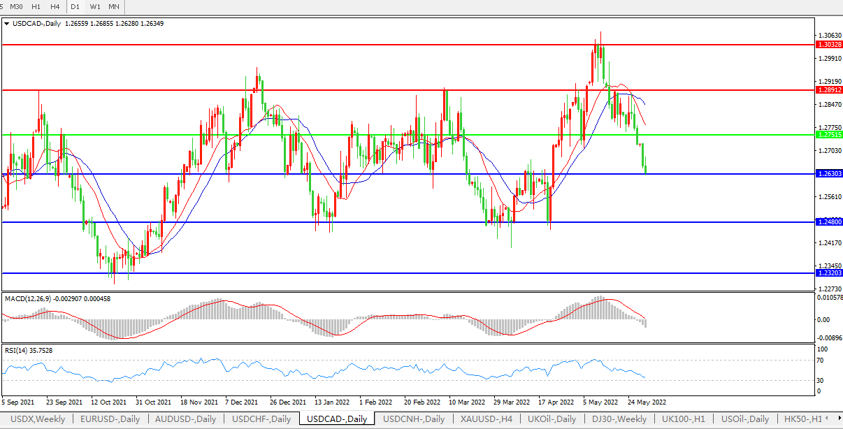 美元兑加元最低触及1.2628,为4月25日以来新低,周三加拿大央行将召开会议,参与调查的30位分析师均预计央行将加息50个基点至1.50%。