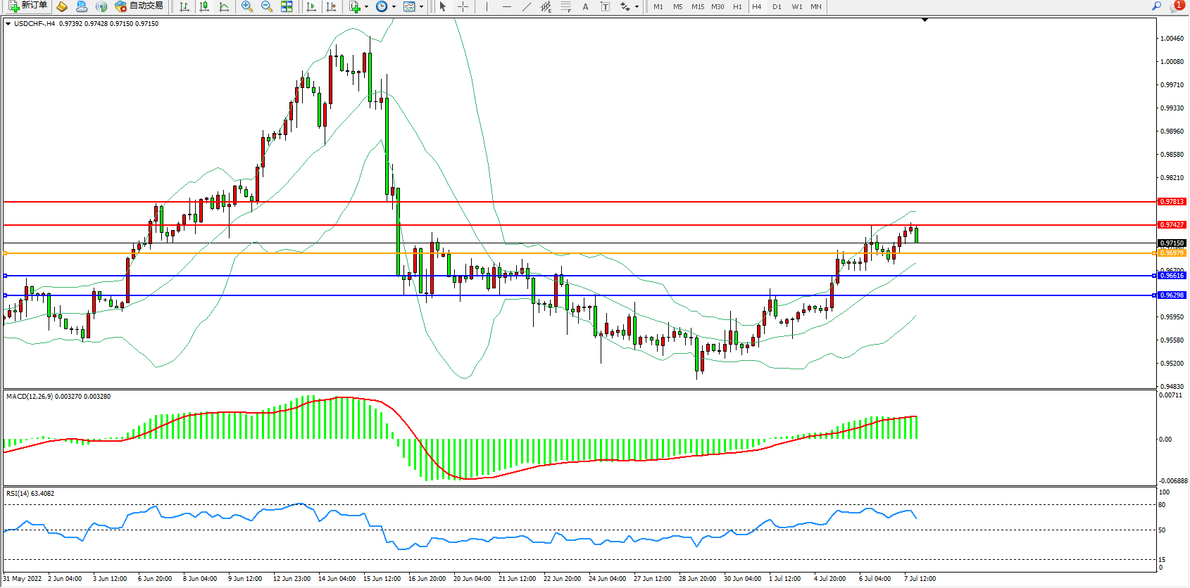 美元兑瑞郎震荡上移至0.97150附近震荡,在俄乌战争、流行病和通胀飙升的情况下,美元兑瑞郎维持弱势上移。美联储决策层一致认为,有必要将利率提高足以使通胀达回落到美联储设定的2%目标所需的高度。