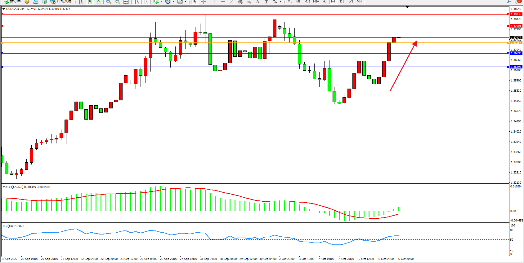 4小时图看:多头动力短期高位震荡拉升上扬,短期多头情绪有继续向上移动态势,MACD指标处于0轴线上側徘徊,RSI指标处于50均衡线上側窄幅整理;