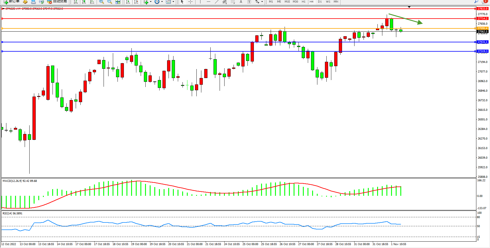 日经225指数11月1日(周二)收盘上涨67.04点,涨幅0.24%,报27654.50点。日本国内制造商和整个地区贸易活动的前景不确定,在升息潮可能导致全球经济衰退之际,进一步对日本决策高层构成挑战。日本10月Au Jibun Bank制造业采购经理人指数(PMI)经季节性调整后从9月终值50.8降至50.7。