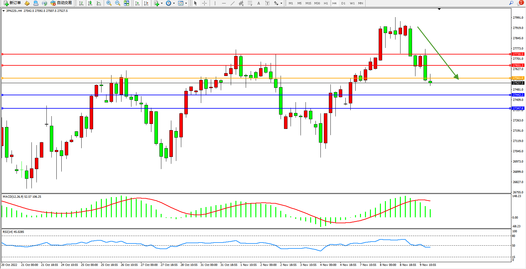 日经225指数11月9日(周三)收盘下跌160.11点,跌幅0.57%,报27712.00点。日本本财年上半年的经常帐盈余创下自2008年全球金融危机以来的最大同比降幅。