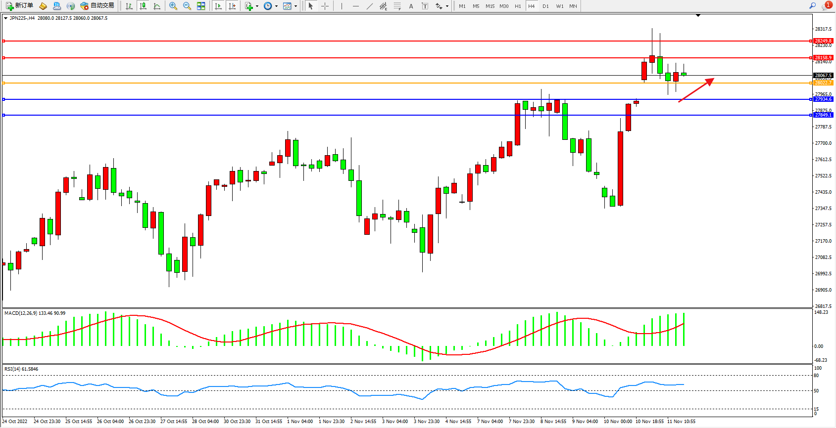 日经225指数11月11日(周五)收盘上涨813.90点,涨幅2.97%,报28260.00点。日本央行11日公布的初步统计结果显示,由于进口商品价格持续飙升叠加日元大幅贬值,日本企业物价指数连续20个月同比上涨,10月同比上升9.1%至117.5,再创有统计以来的新高。
