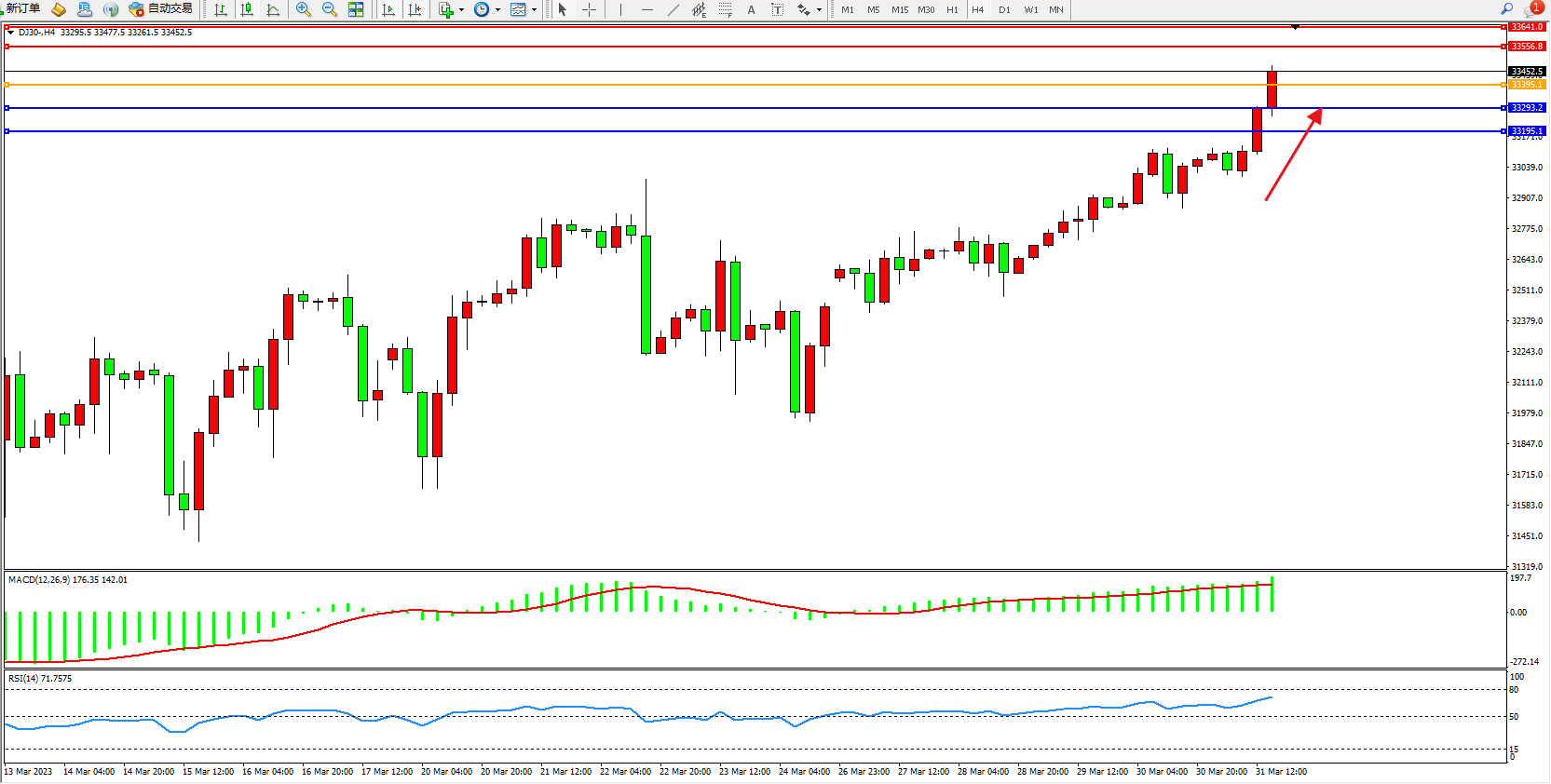 道琼斯指数3月31日(周五)收盘上涨415.12点,涨幅1.26%,报33274.15点;根据 CME Group的Fedwatch工具,交易员押注5月加息25个基点的概率为55.5%,暂停加息的概率为44.5%。一些美联储官员指出,银行业问题可能对经济造成打击,而近期数据(包括每周申请失业救济人数上升)支持了人们的希望,即美联储即将结束加息。