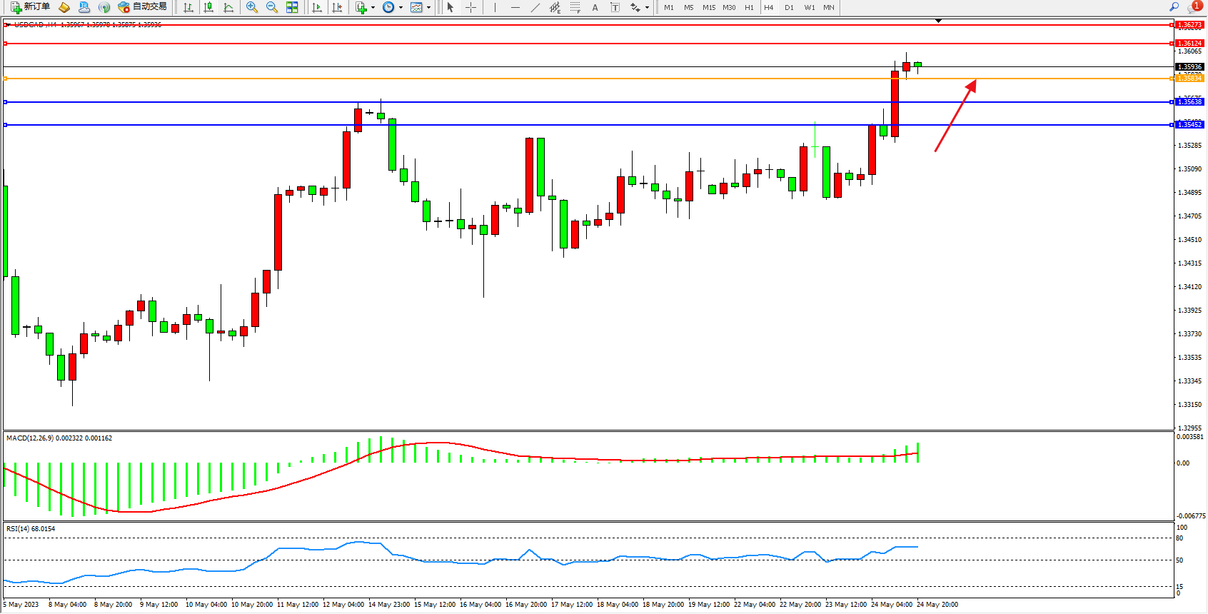 美元兑加元维持1.35936附近震荡,在沙特对卖空者发出威胁后,油价开始转为看涨,沙特阿拉伯可能会不惜一切代价捍卫价格。美国今年的阵亡将士纪念日假期是5月29日,传统上标志着美国夏季旅游高峰的开始。但市场仍然对美国债务上限的讨论持谨慎态度,这限制了油价涨幅。
