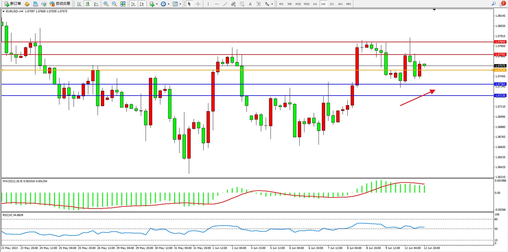 欧元美元EURUSD—4小时K线图显示: