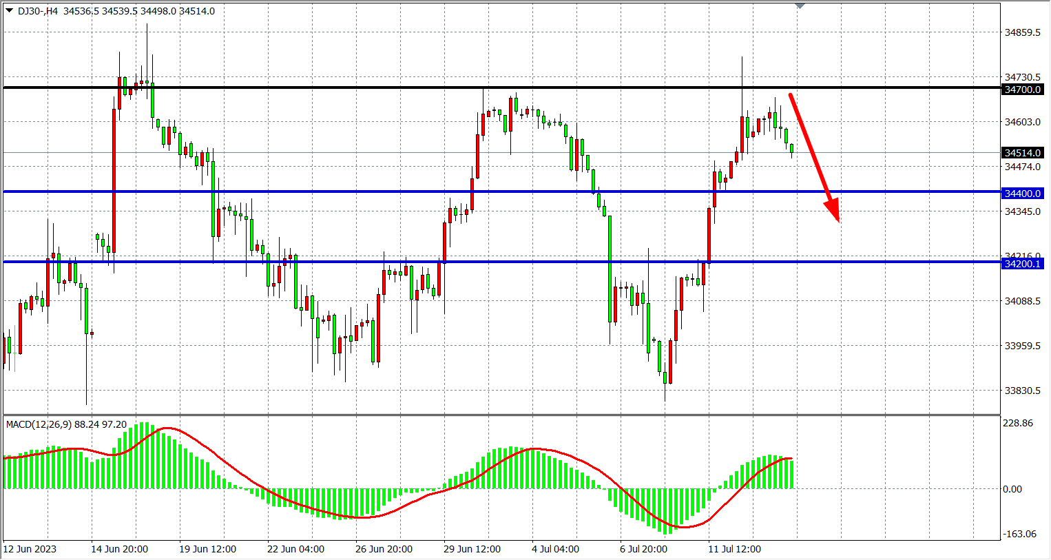 交易策略:34700 下方看跌,目标 34400  34200