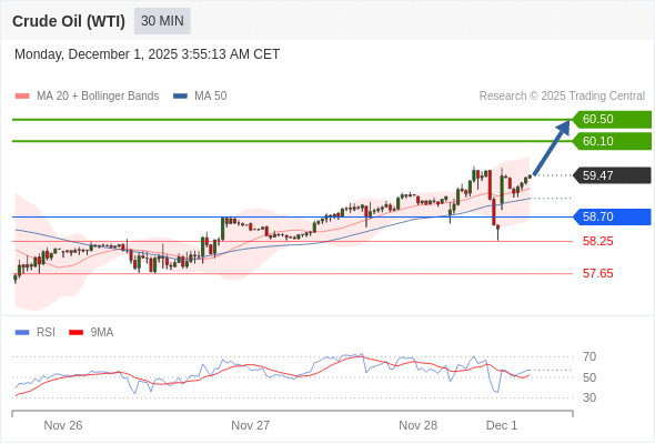在 58.70 之上,看涨,目标价位为 60.10 ,然后为 60.50 。
